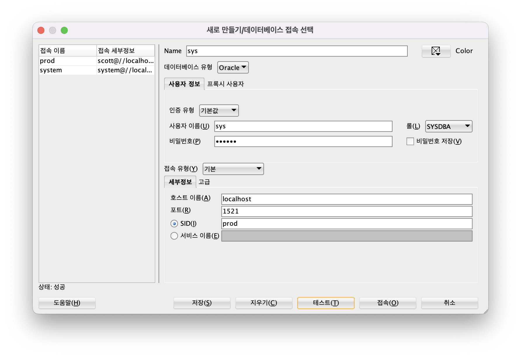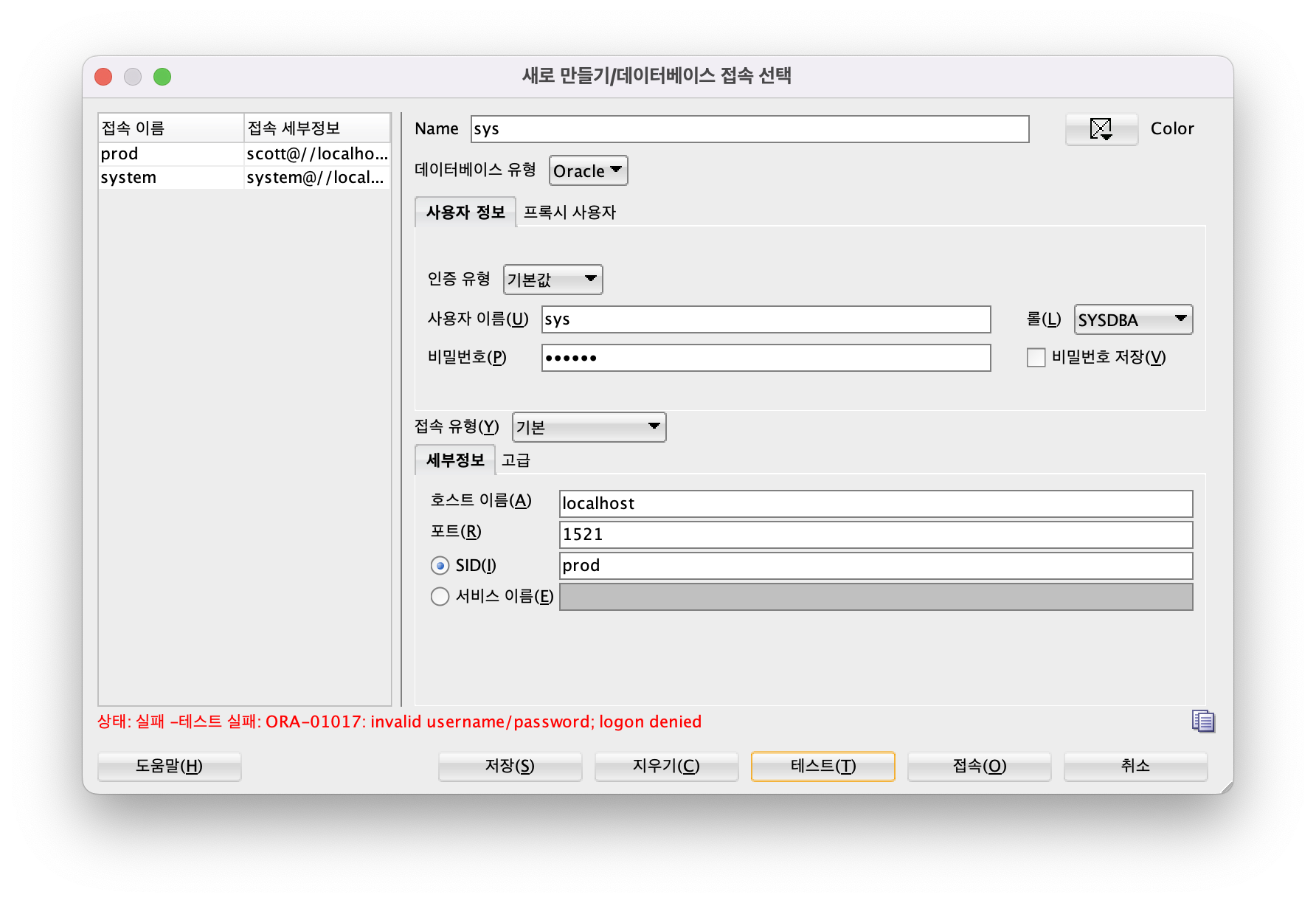 오라클에서 제공하는 SQL developer 에서 system 또는 sys 계정에 접속하고자 할 때, 정확한 비밀번호를 입력했음에도 불구하고 접속이 안되는 경우가 있다.