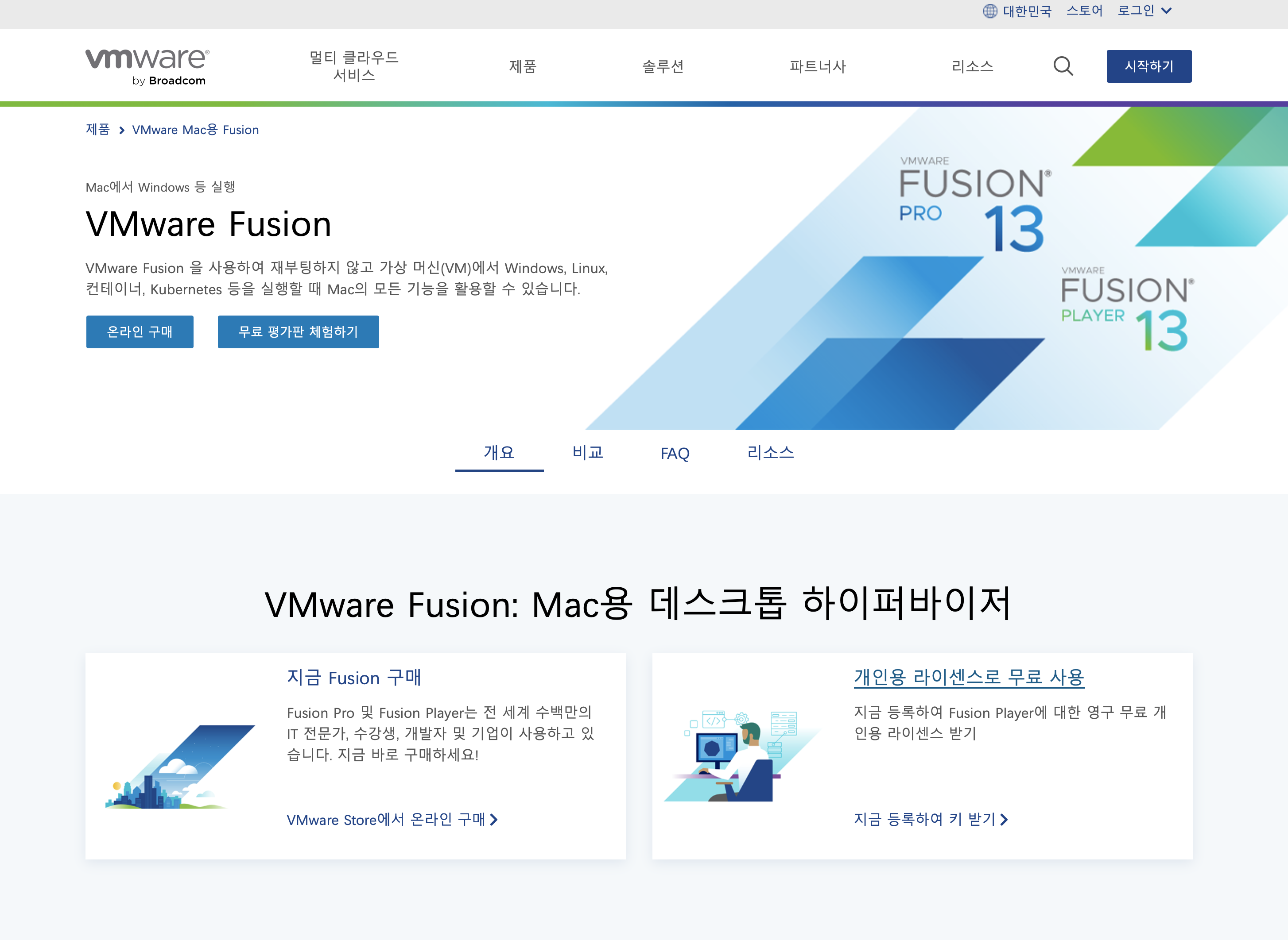 - VMWare 는 상업적으로 유료이나, 개인적인 용도로는 무료로 사용할 수 있습니다.(회원가입 필요)