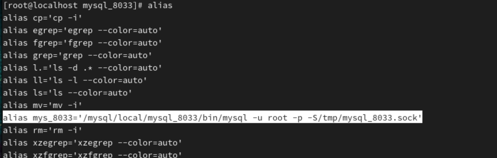 | $ vi /etc/profile . . alias mys_8033='/mysql/local/mysql_8033/bin/mysql -u root -p -S/tmp/mysql_8033.sock' $ source /etc/profile # profile 적용 |