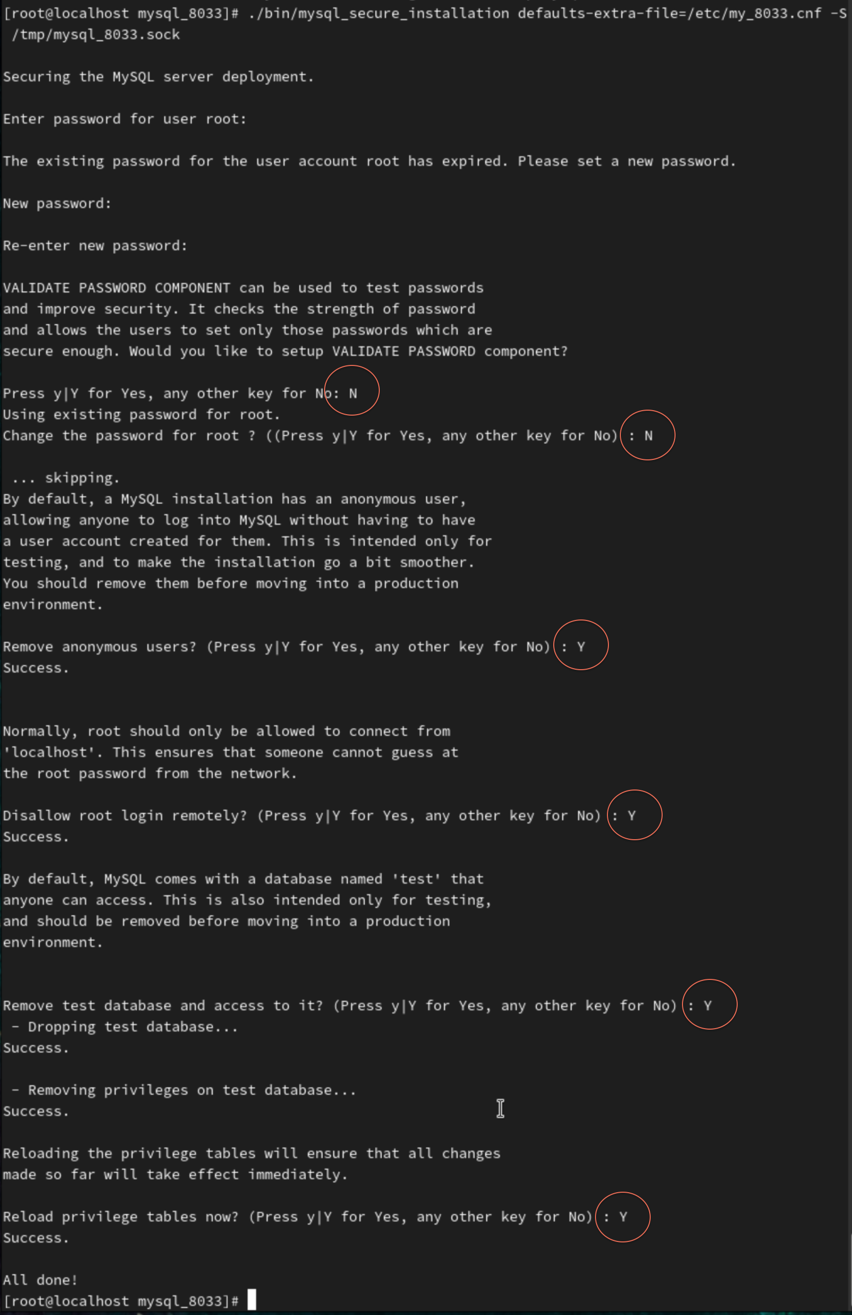 | $ /mysql/local/mysql_8033/bin/mysql_secure_installation defaults-extra-file=/etc/my_8033.cnf -S /tmp/mysql_8033.sock |