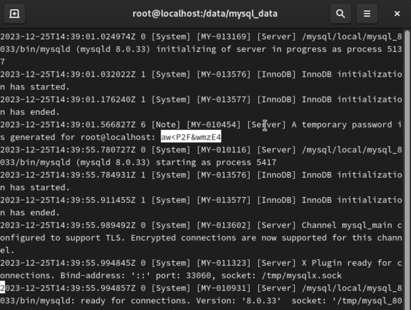 # 실행하면 초기 루트 암호를 물어보는데, 암호는 mysql 로그파일에 기입되어 있습니다.