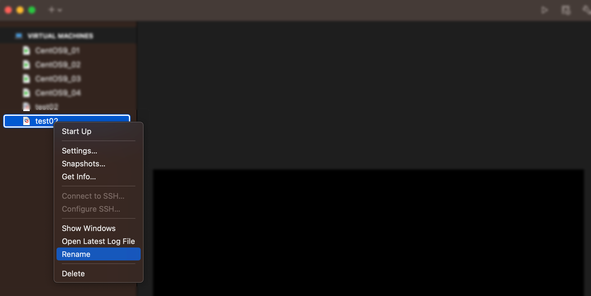 - 화면 상단바를 보면 test02이라는 이름으로 실행되어, OS 종료후 VMWare 실행창 화면에서 Rename 후 재실행
