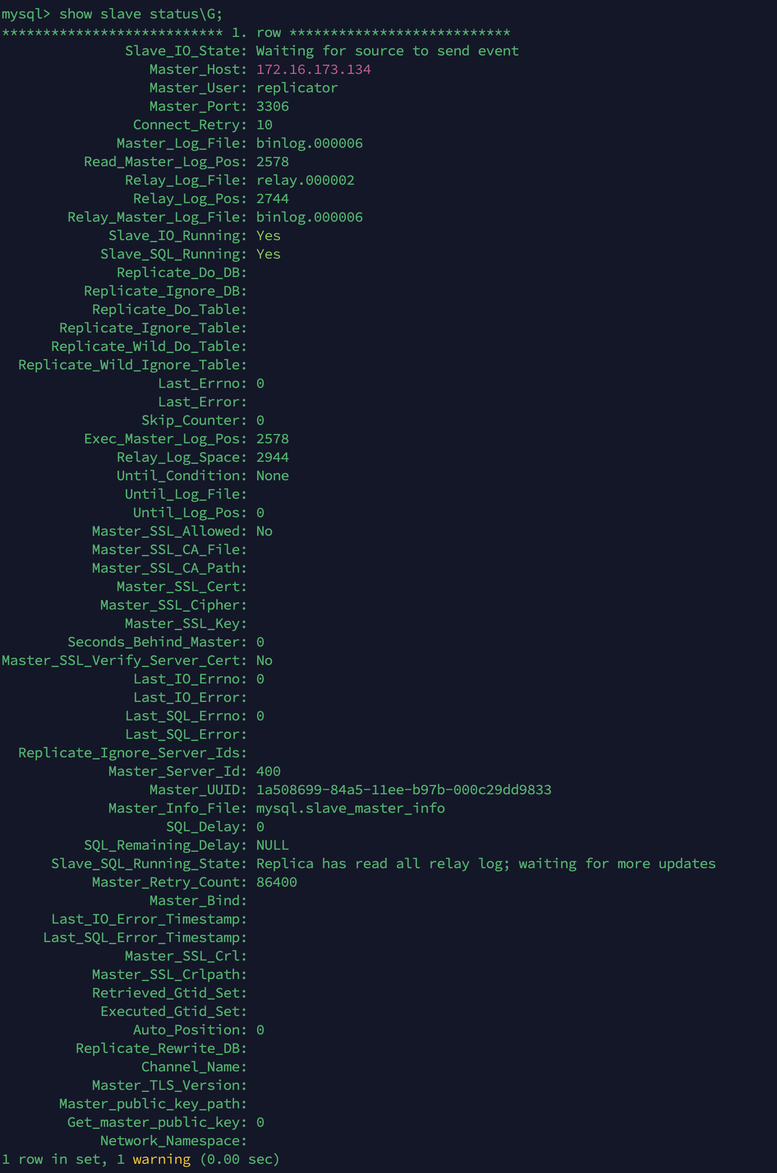 Query OK, 0 rows affected, 1 warning (0.01 sec)