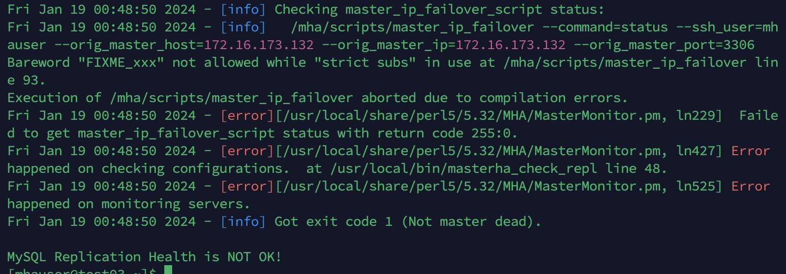 Tue Jan 16 22:40:03 2024 - [error][/usr/local/share/perl5/5.32/MHA/MasterMonitor.pm, ln427] Error happened on checking configurations. at /usr/local/bin/masterha_check_repl line 48.