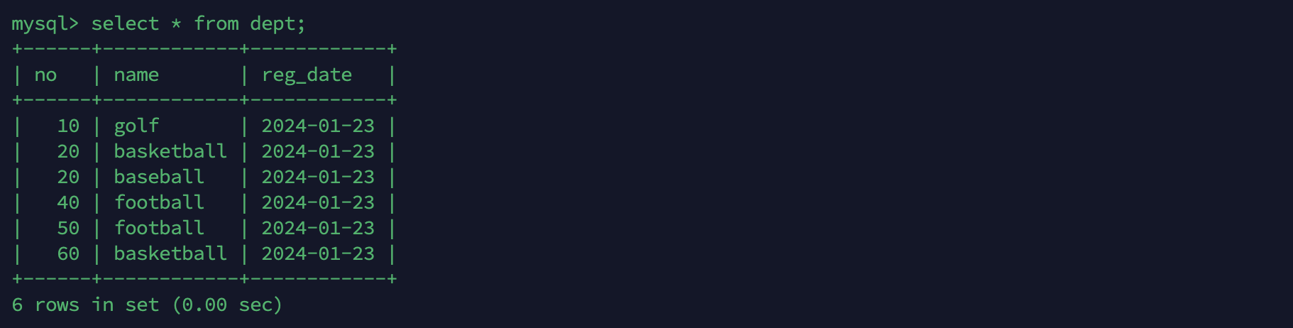 mysql> insert into dept values(80,'soccer','2023-01-00');