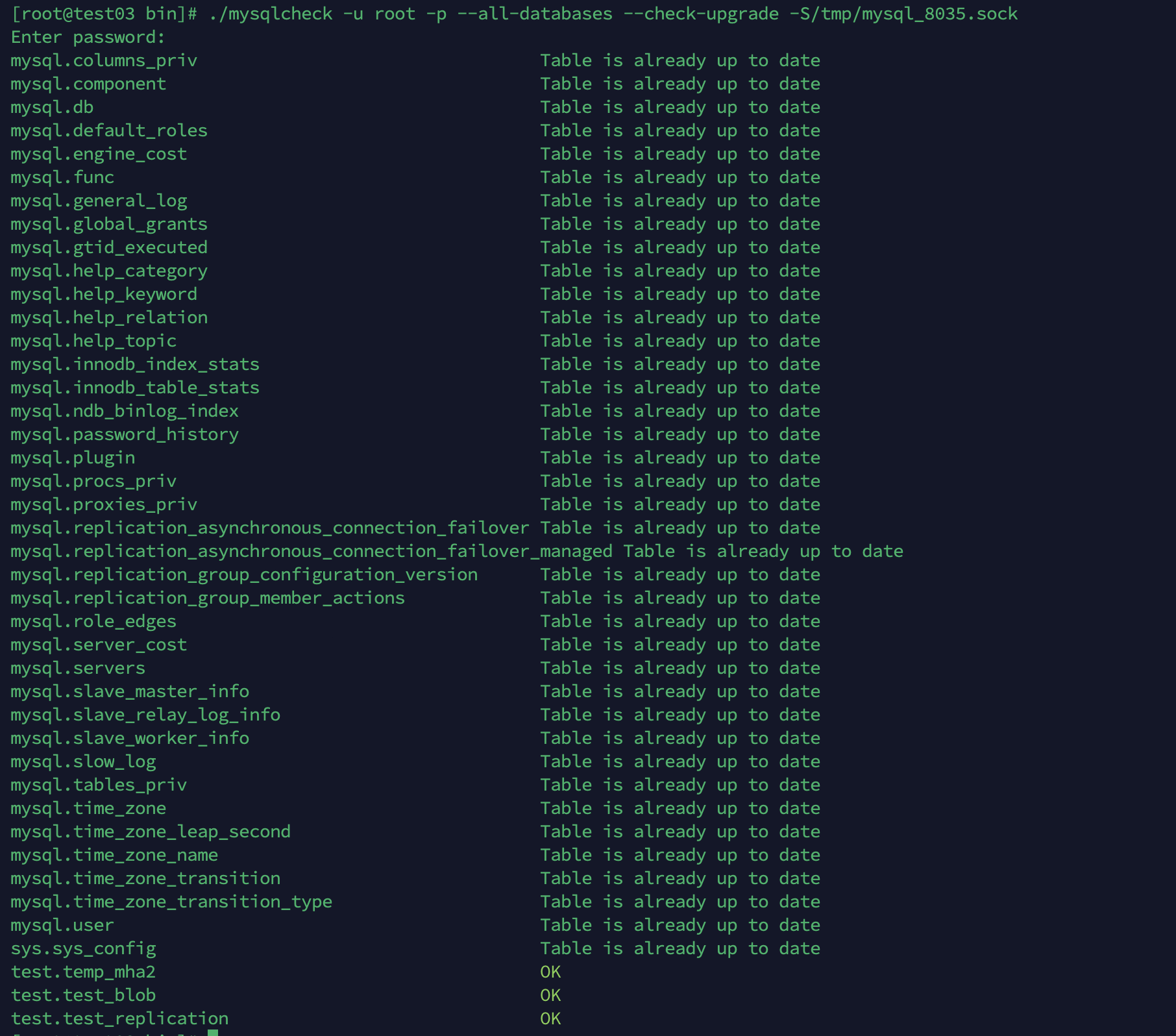[root@test03 bin]# ./mysql_upgrade -uroot -p -S /tmp/mysql_8035.sock