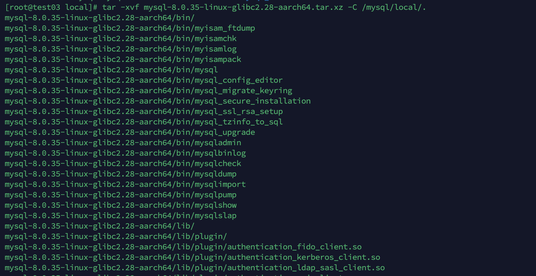 tar -xvf mysql-8.0.35-linux-glibc2.28-aarch64.tar.xz -C /mysql/local/.