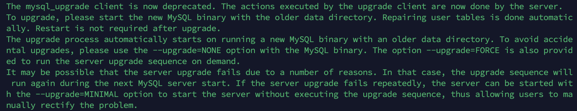 - 만약 8.0.16 상위 버전에서 이 작업을 실행했다면 다음과 같은 문구를 보여줍니다. --upgrade 옵션을 사용하라고 나옵니다.