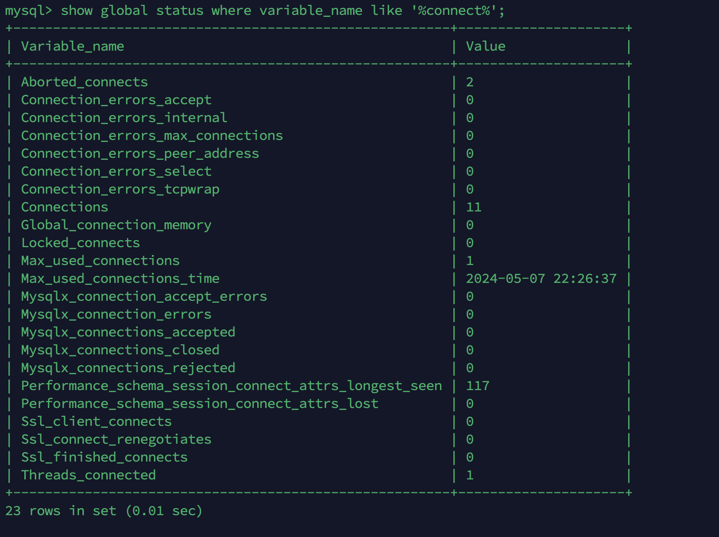 mysql> show global status where variable_name like '%connect%';