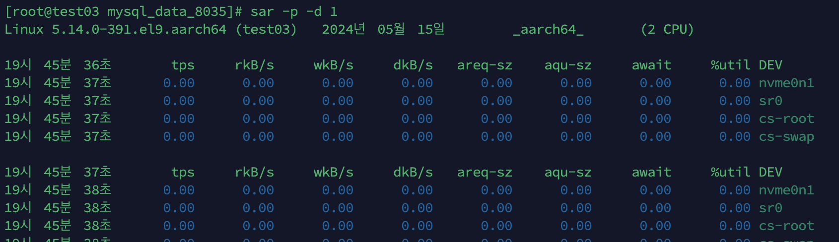 $ sar -p -d 1 | grep xvd # await, wkB/s, rkB/s, tps, idle 확인