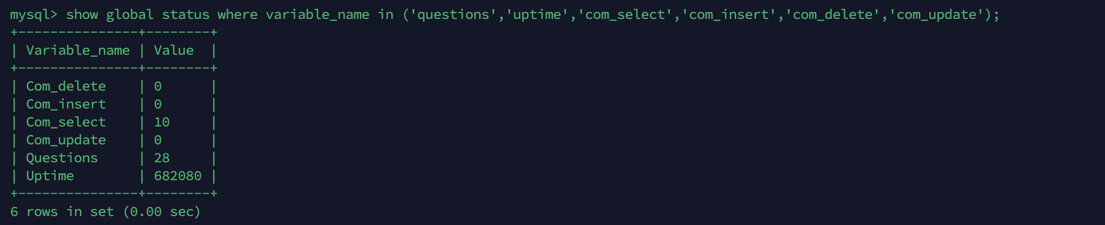 mysql> show global status where variable_name in ('questions','uptime','com_select','com_insert','com_delete','com_update');