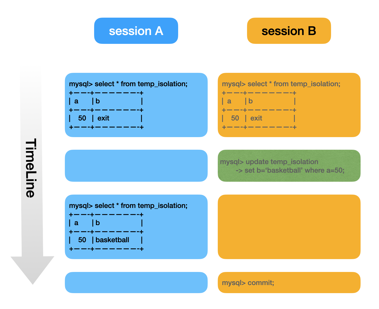 # 트랜잭션이 동시에 발생하였을 경우, 동일 데이터에 대해서 세션별 결과값이 다르게 보여질 수가 있습니다.
