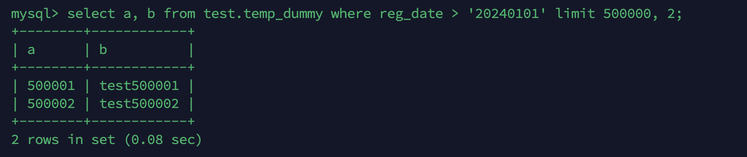 mysql> select a,b from test.temp_dummy where a between 1 and 10; # 1페이지
