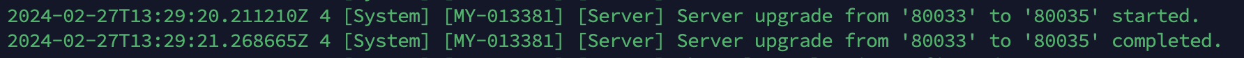 # 초기 인스턴스 실행했을 때 mysql.log 를 보면 아래와 같은 문구가 보이는데, 이것은 업그레이드를 자동으로 했다는 것을 말하는게 아닐까 생각됩니다.