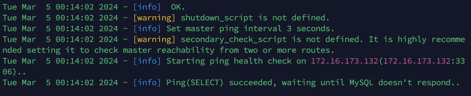 mha (pid:276453) is running(0:PING_OK), master:172.16.173.132