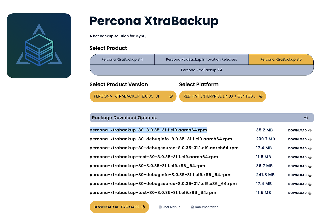 - PERCONA-XTRABACKUP-8.0.35-31 버전에만 aarch64 버전이 존재하는 것으로 보입니다.